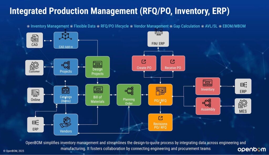 There’s no need for a separate ERP system — OpenBOM serves as both the engineering and procurement backbone. It’s ideal for startups, prototype manufacturers, and companies that prioritize speed and visibility over heavy infrastructure.